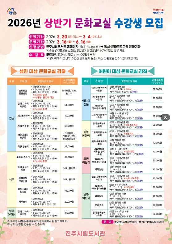 [더조은뉴스]진주시립도서관은 오는 20일부터 어린이와 성인을 대상으로 ‘2026년 상반기 문화교실’ 수강생을 모집한다.