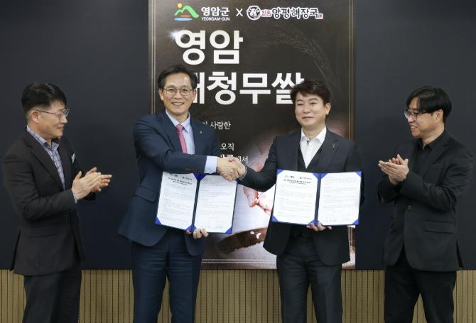 [더조은뉴스]영암군이 11일 군청에서 ‘일품양평해장국’ 외식 프랜차이즈 ㈜우분트월드와 영암 농특산물 판매 활성화 업무협약을 체결했다.