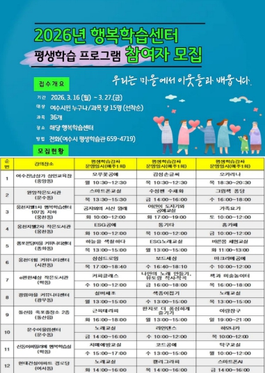 [더조은뉴스]여수시는 시민 누구나 가까운 마을에서 배움의 기회를 누릴 수 있도록 ‘2026년 행복학습센터 상반기 평생학습 프로그램’ 참여자를 오는 27일까지 모집한다고 밝혔다.