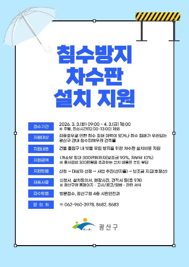 [더조은뉴스]광주 광산구가 집중호우로 인한 침수 피해 예방을 위해 ‘2026년 광산구 침수방지 차수판 설치 지원사업’을 추진한다.