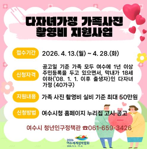 [더조은뉴스]여수시가 다자녀 가정의 소중한 일상을 기록하고 가족 간 유대감을 높이기 위해 가족사진 촬영비 지원에 나선다.