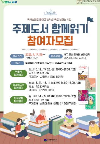 독서 동아리에 관심 있는 지역 주민 누구나 참가할 수 있으며 참여 신청은 17일부터 서구 통합도서관 누리집을 통해 선착순으로 받는다.