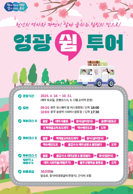 [더조은뉴스] 영광군은 4월 18일부터 10월 31일까지(7∼8월 폭염으로 제외) 토요 감성 힐링 여행‘2026년 영광 쉼 투어’를 매주 토요일 운영 한다고 밝혔다.