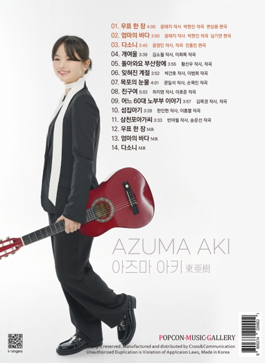 아즈마 아키는 4월 앨범 발표와 동시에 팬들을 위한 화보집을 발간하며, 신곡 음원 서비스 및 방송 활동, 뮤직비디오 공개를 통해 팬들을 찾아갈 예정이다. 또한, 음반 발매를 기념해 서울과 부산을 시작으로 한 전국 콘서트 투어를 개최하며 본격적인 한국 활동을 이어갈 계획이다. 이번 앨범 작업에도 직접 참여한 삼천포아가씨가요제 이미연 대회장은 “우리 가요제 출신이자 홍보대사인 박서진과 더불어 아즈마 아키가 우리 사천이 제2의 고향이 되어 지역 홍보에 앞장설 수 있도록 많이 응원해 달라.” 고 당부했다.