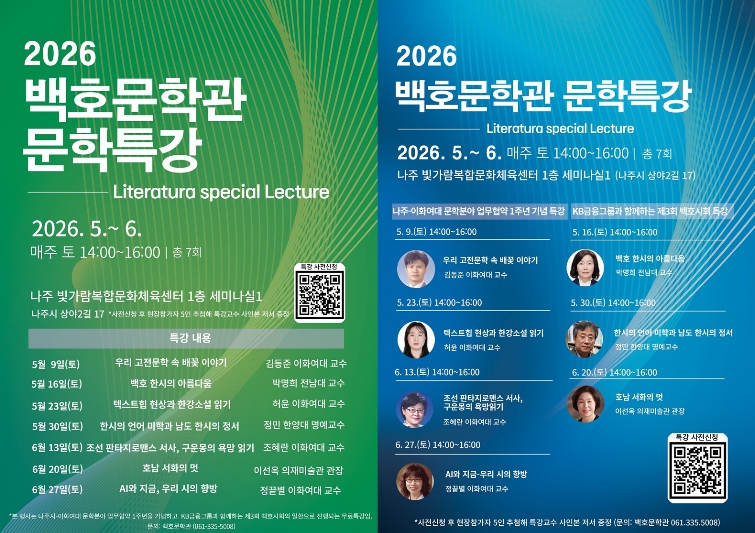 [더조은뉴스]전남 나주시가 백호문학관에서 이화여자대학교와 함께 고전부터 현대, 미래 문학까지 아우르는 K-문학특강을 운영하며 시민 대상 문학 향유 기회를 확대한다.