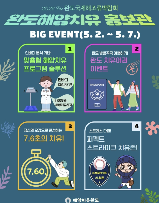 [더조은뉴스]‘2026 Pre 완도국제해조류박람회’ 개최 기간(5.2~5.7) 동안 완도만의 해양치유 콘텐츠를 선보이는 ‘해양치유 홍보관’을 운영한다.