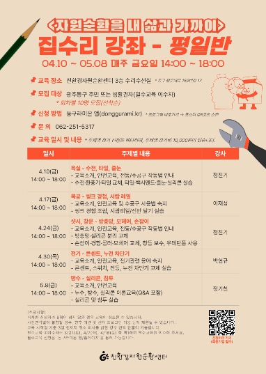 [더조은뉴스]광주 동구 친환경자원순환센터는 일상 속에서 집수리 노하우를 익힐 수 있는 ‘2026 동구 집수리 강좌’를 5월 9일까지 약 한 달간 운영한다고 밝혔다.